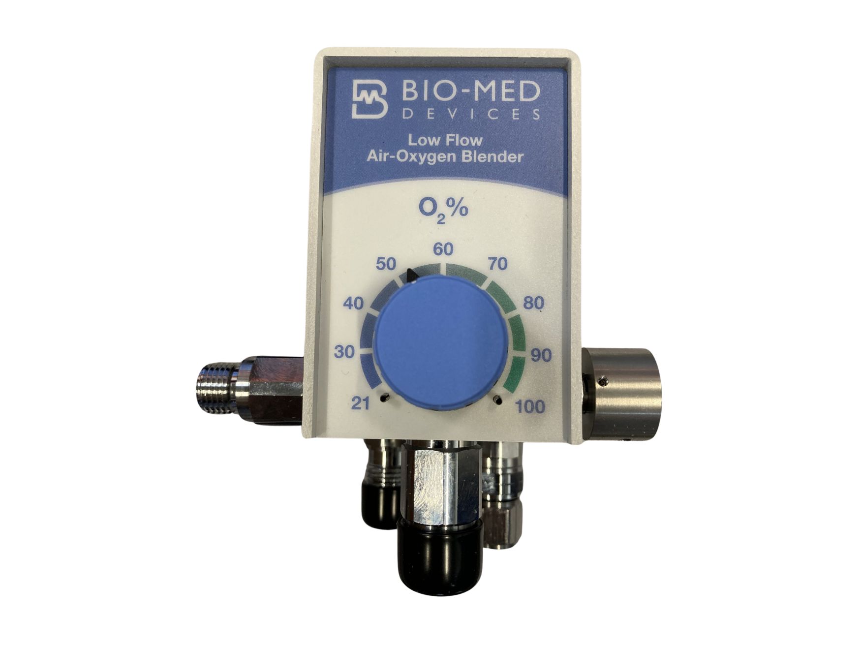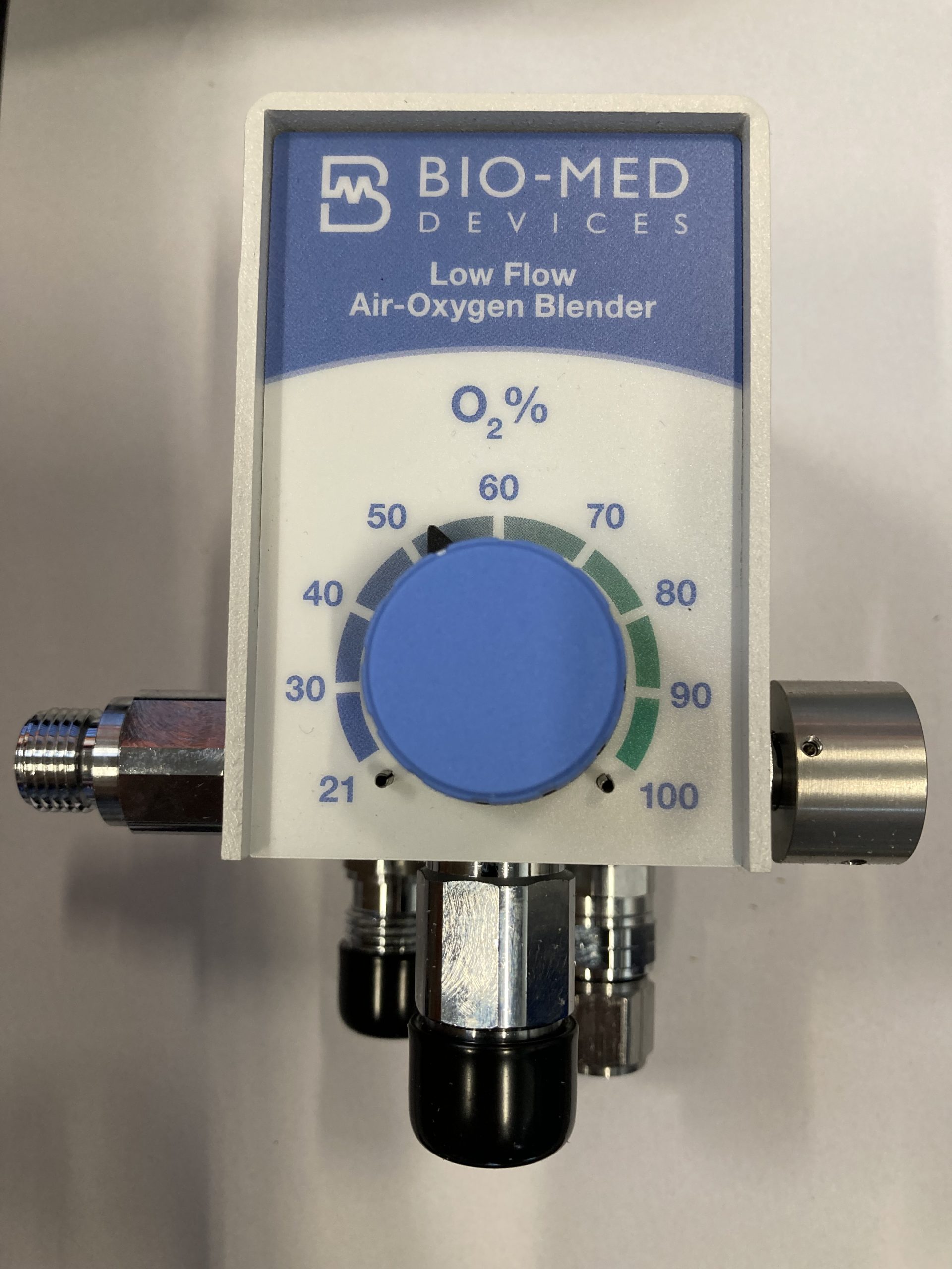 BIO-MED low flow mixer m. 0-30 ltr. i venstre side og bleed on/off i højre side, komplet med klo, slanger, in-line regulator og stiknipler
