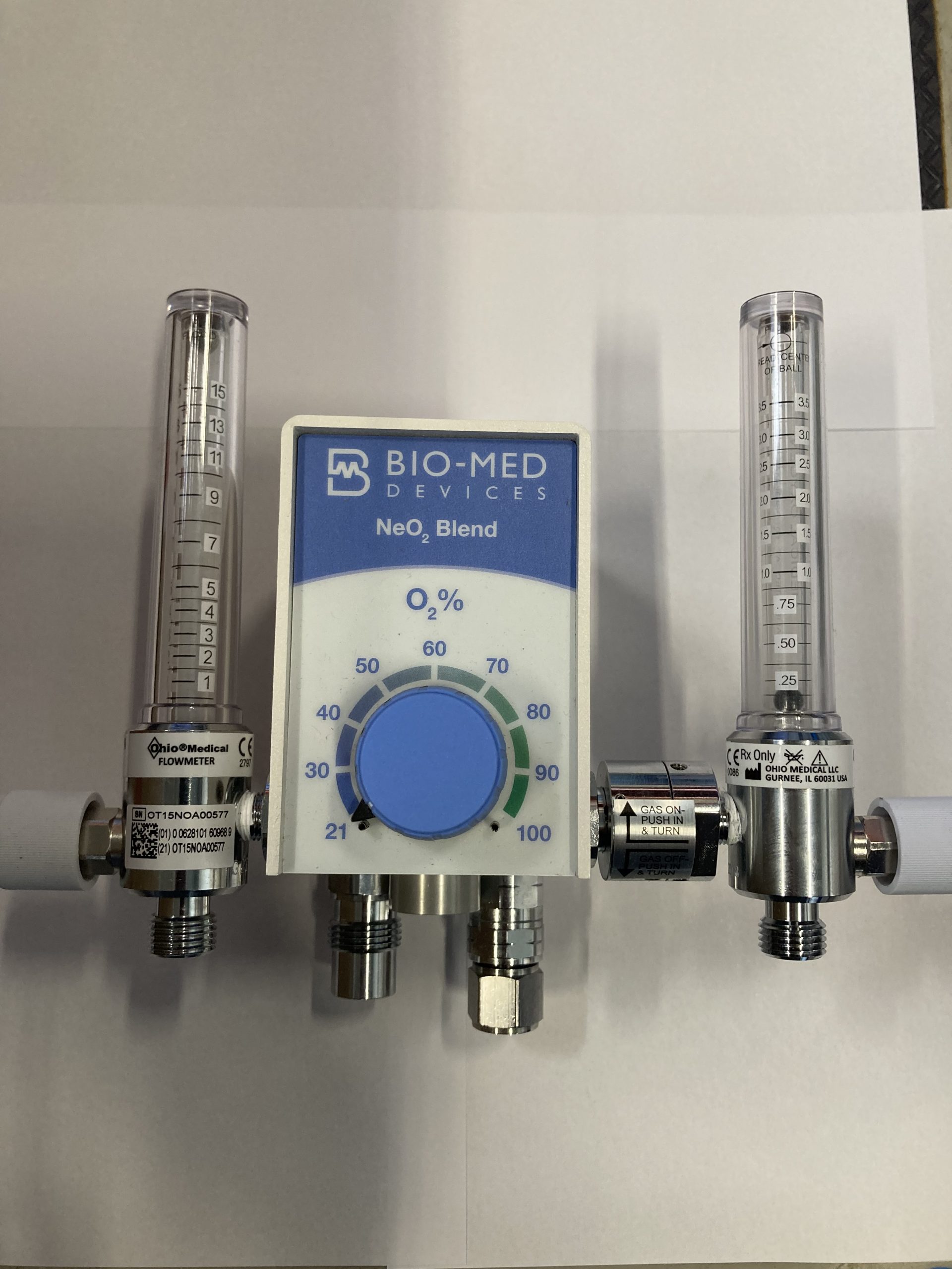 BIO-MED neo mixer m. flowmeter 0-15 L/min i venstre side og flowmeter 0-3,5 L/min i højre side, komplet med klo, slanger, in-line regulator og stiknipler