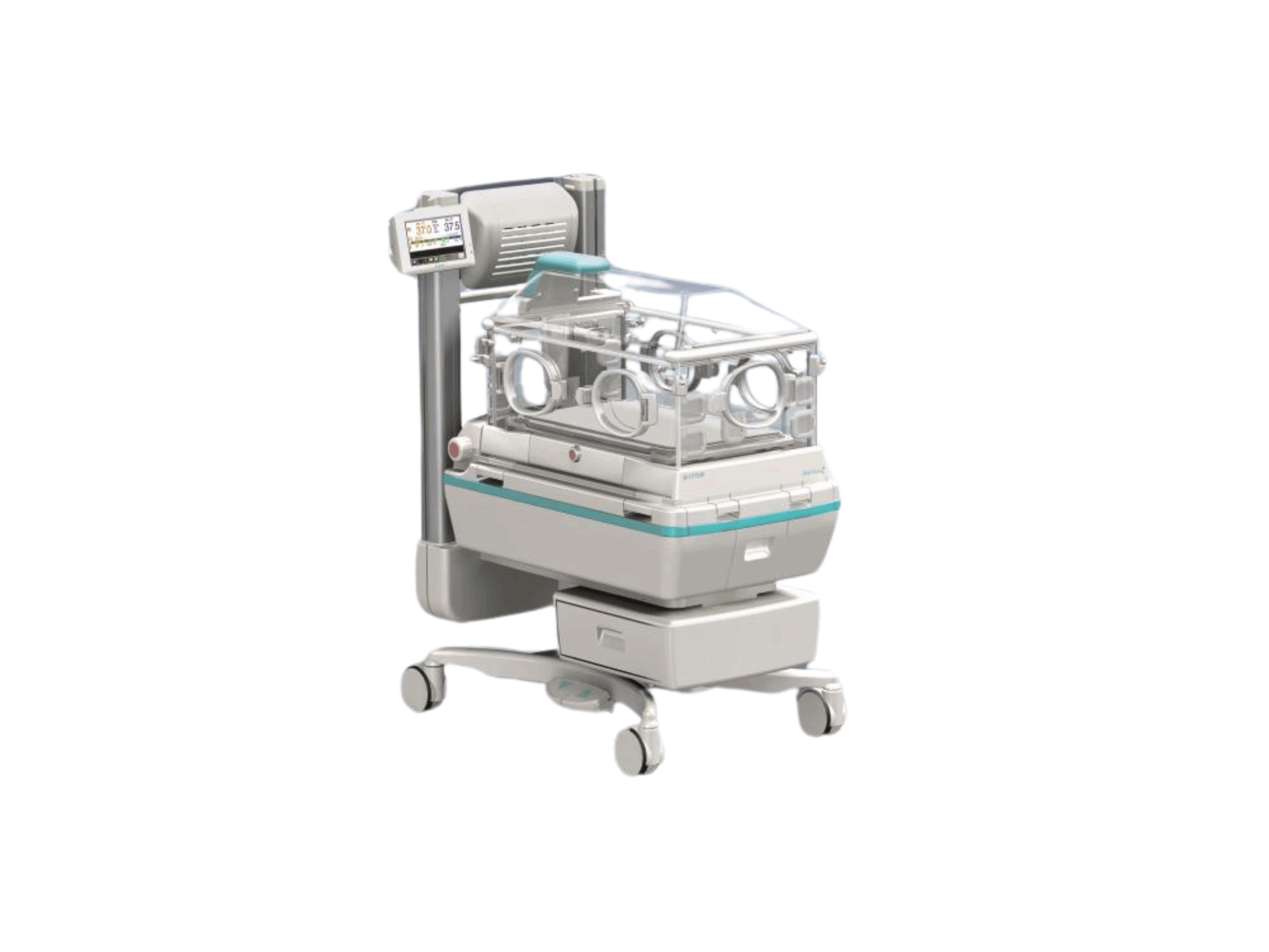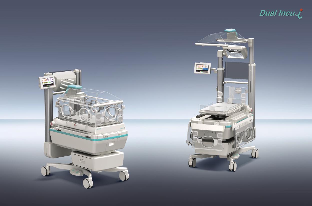 Dual Incu i kuvøsen tilfredsstiller en række behov indenfor nyfødt medicin via åben eller lukket modus. Også til intra hospital transport med UPS og påmonteret Ilt og luft flasker (option). Øvre del kan hæves, så man får bedre tilgang til procedurer.