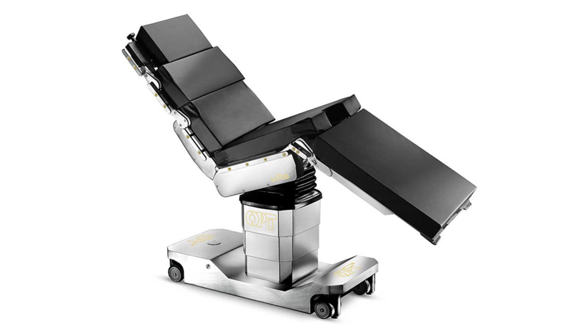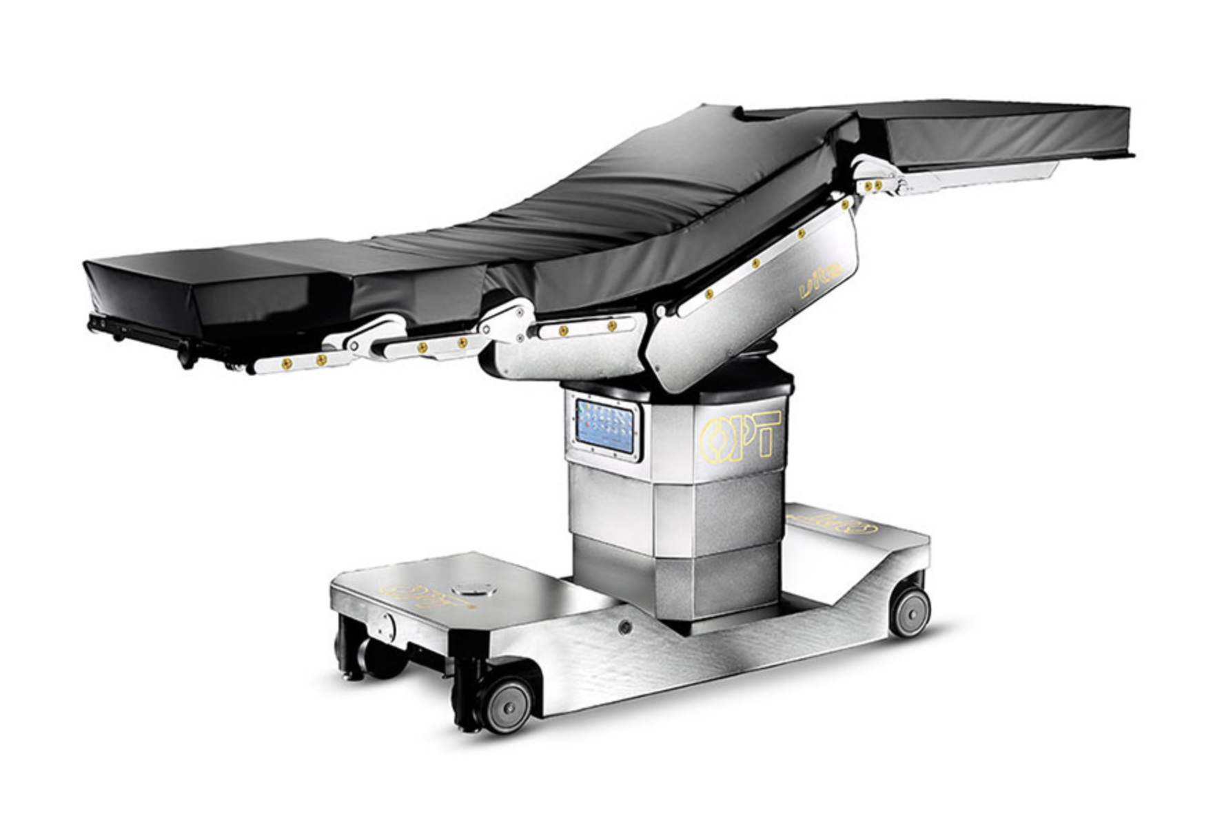 Længdeforskydelig lejetop – anti kollision system – mulighed for 5. hjul og elektrisk motordrive – unik ”fix torgue” påhæftning af moduler, som passer på samtlige OPT operationslejer – trådløs fjernbetjening m. touch display og visning af grader, højder m.m. – integreret touchpanel i sokkel.